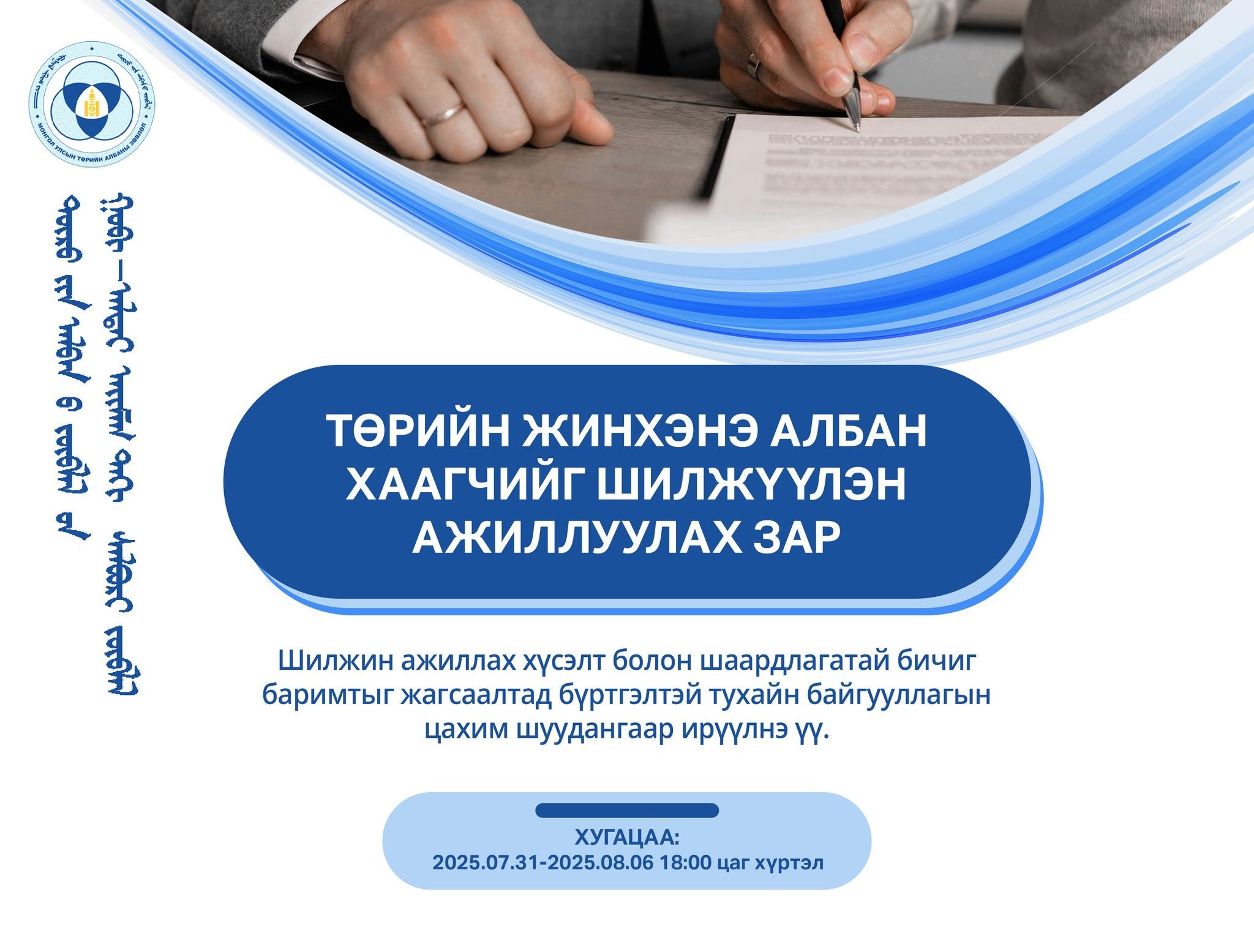 ТӨРИЙН ЖИНХЭНЭ АЛБАН ХААГЧИЙГ ШИЛЖҮҮЛЭН АЖИЛЛУУЛАХ ЗАР